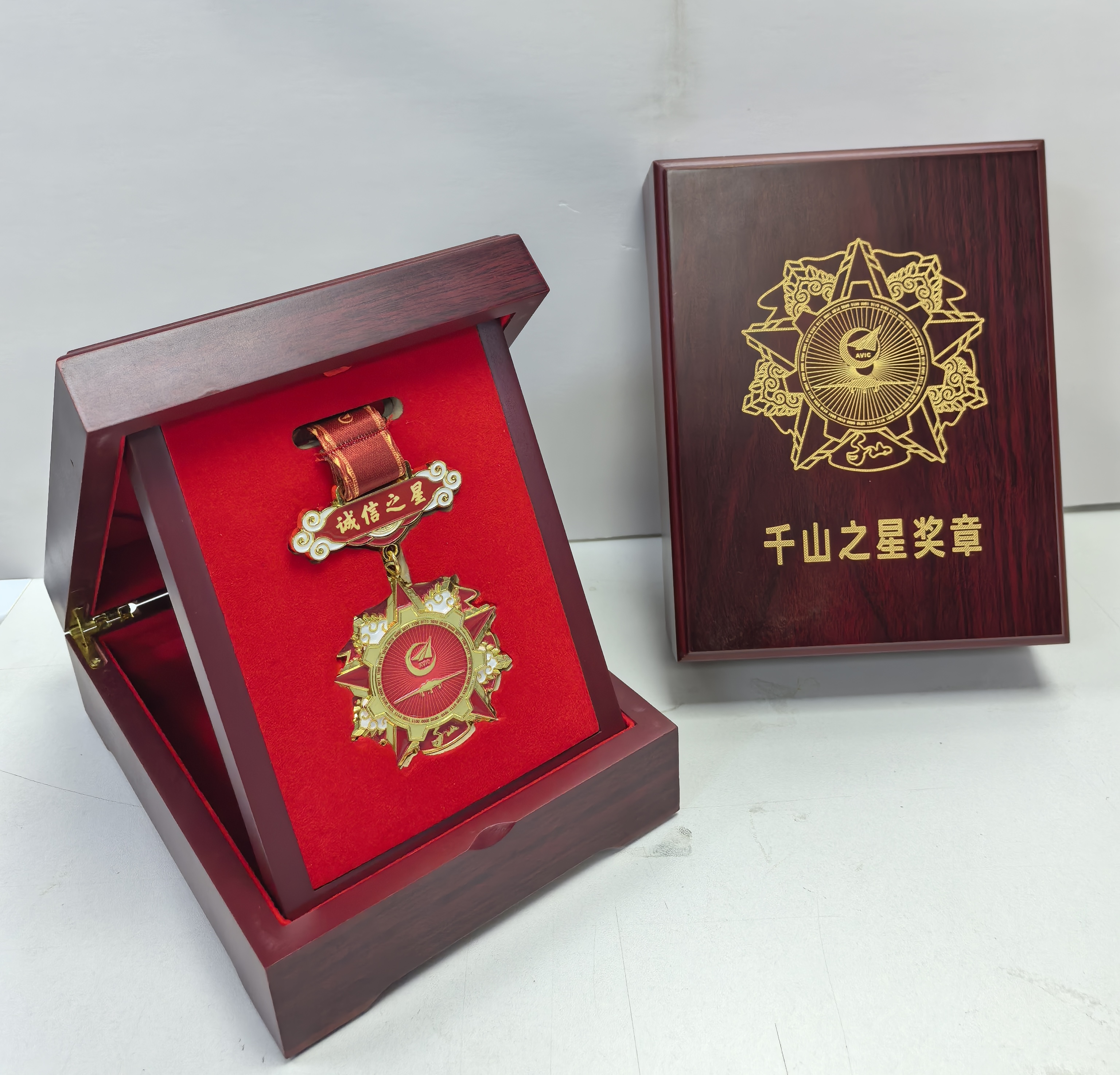 “千山之星”獎章,通過我司和客戶兩個月的設計優化,最終章體通徑55毫米,寓意千山建廠55周年;19組數據代碼、69根光芒射線、4枚盾牌、7個齒輪,寓意千山于1969年4月7日正式建廠。